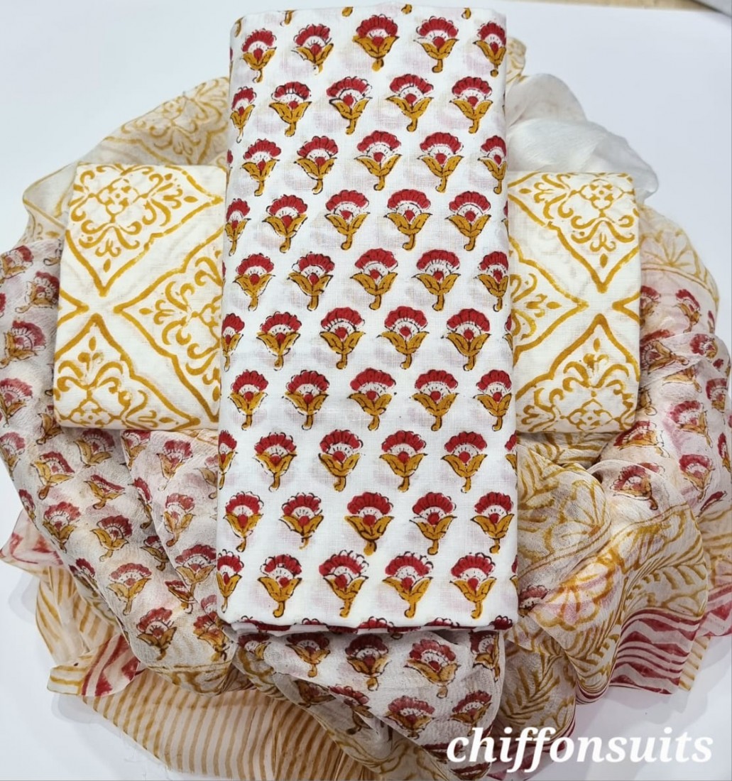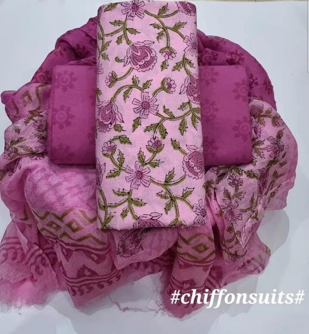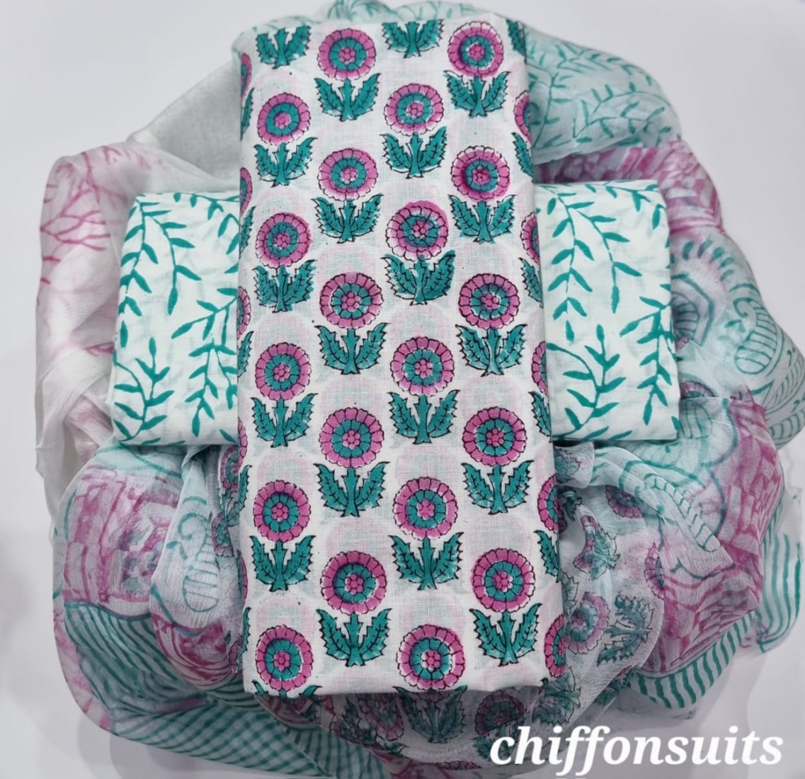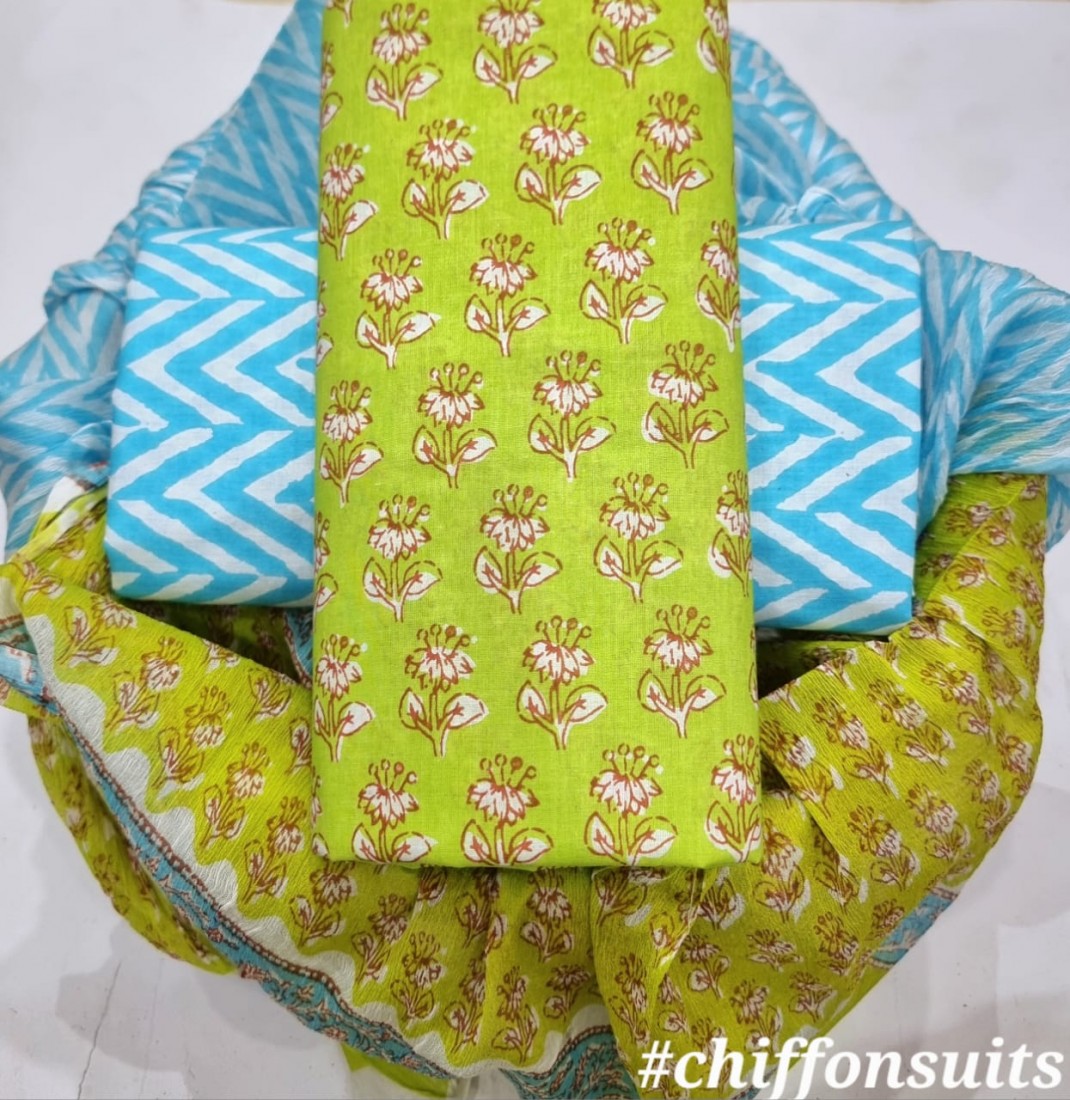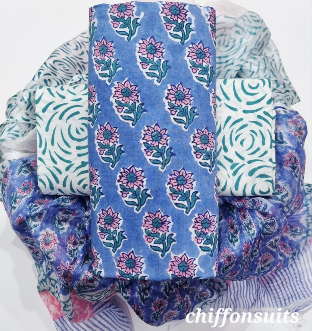 new hand block printed cotton dress materials with chiffon duptta