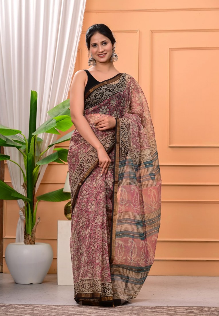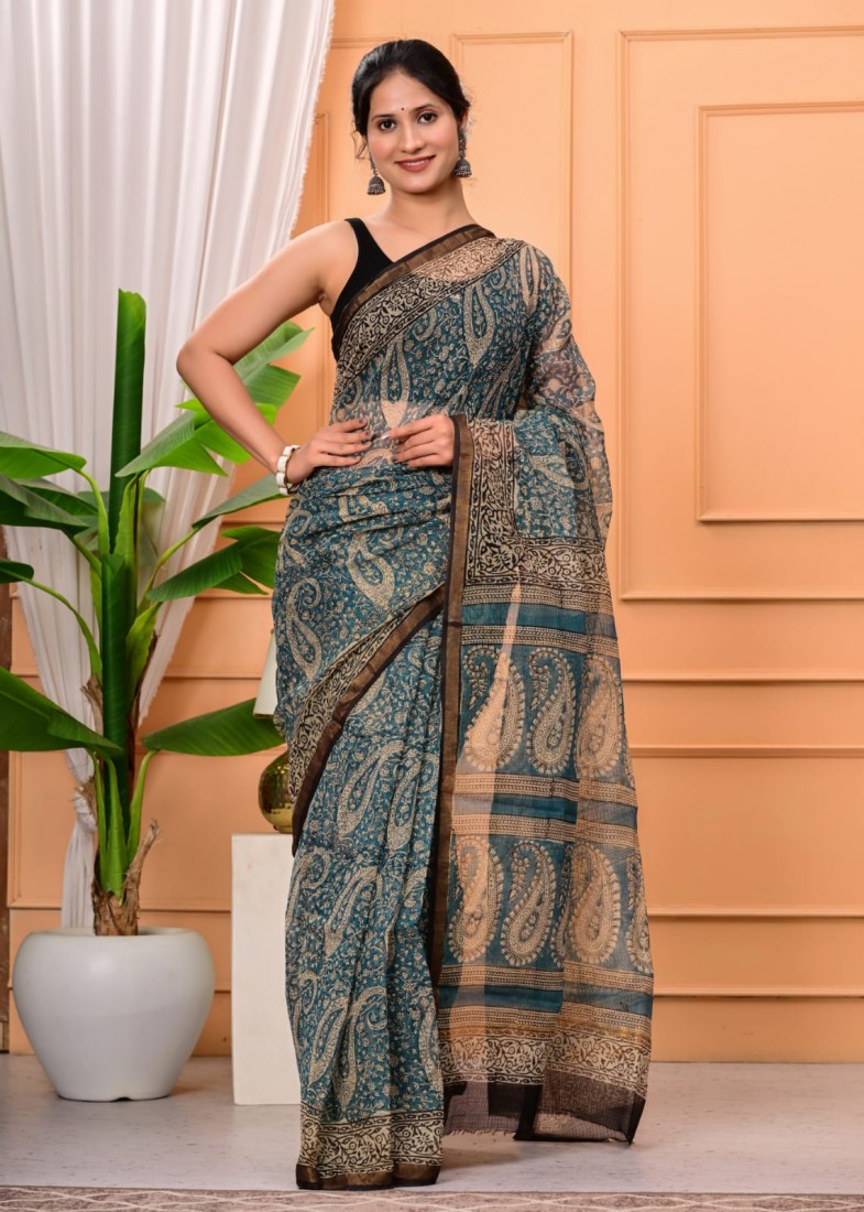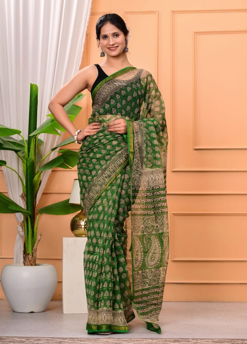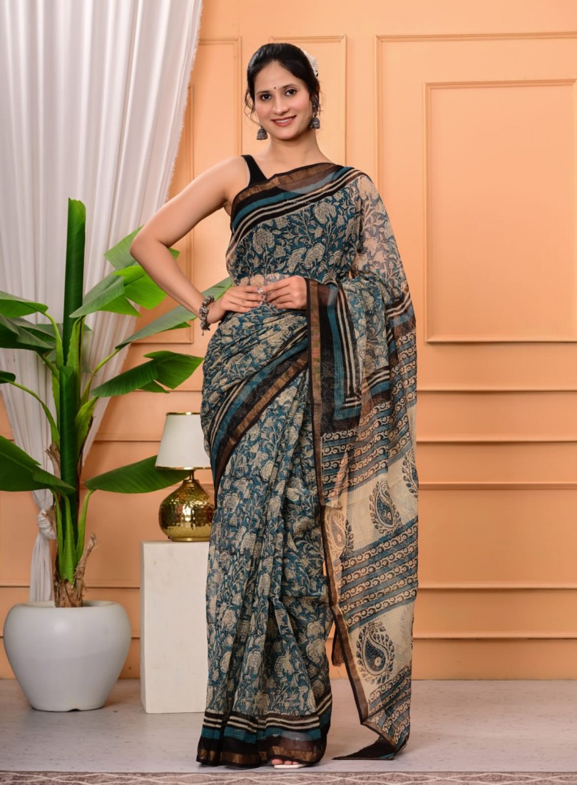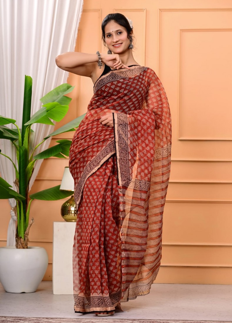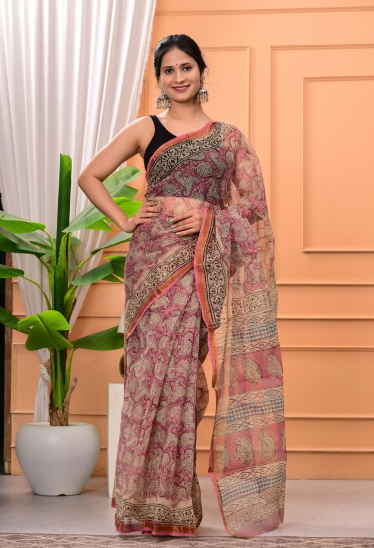 Hand block prints natural colors in kota doriya saree with blouse
