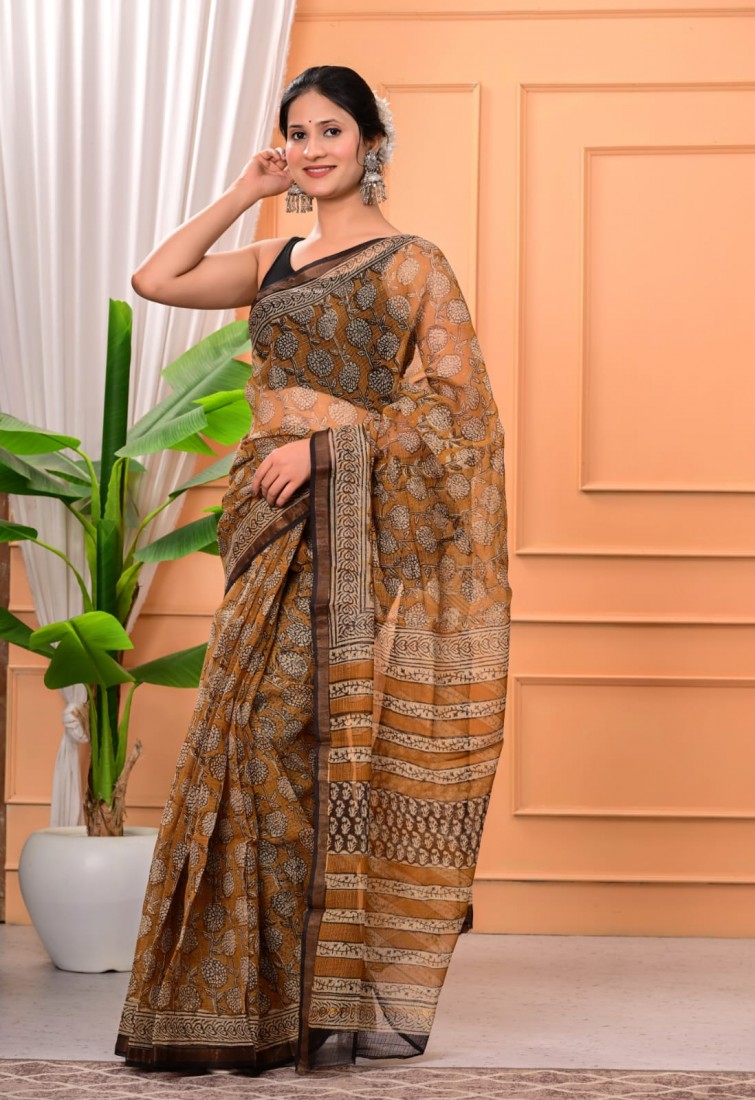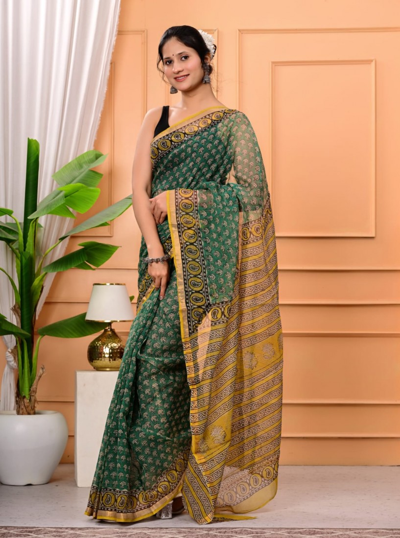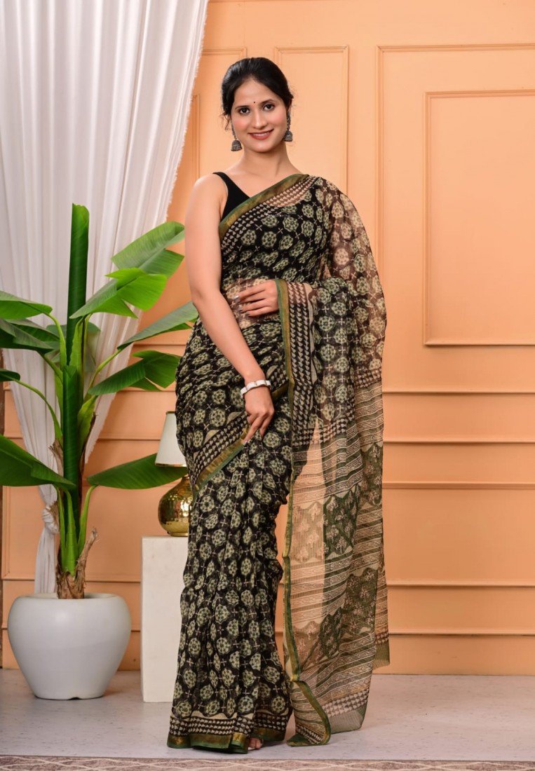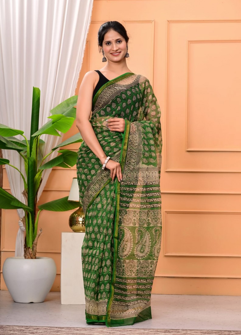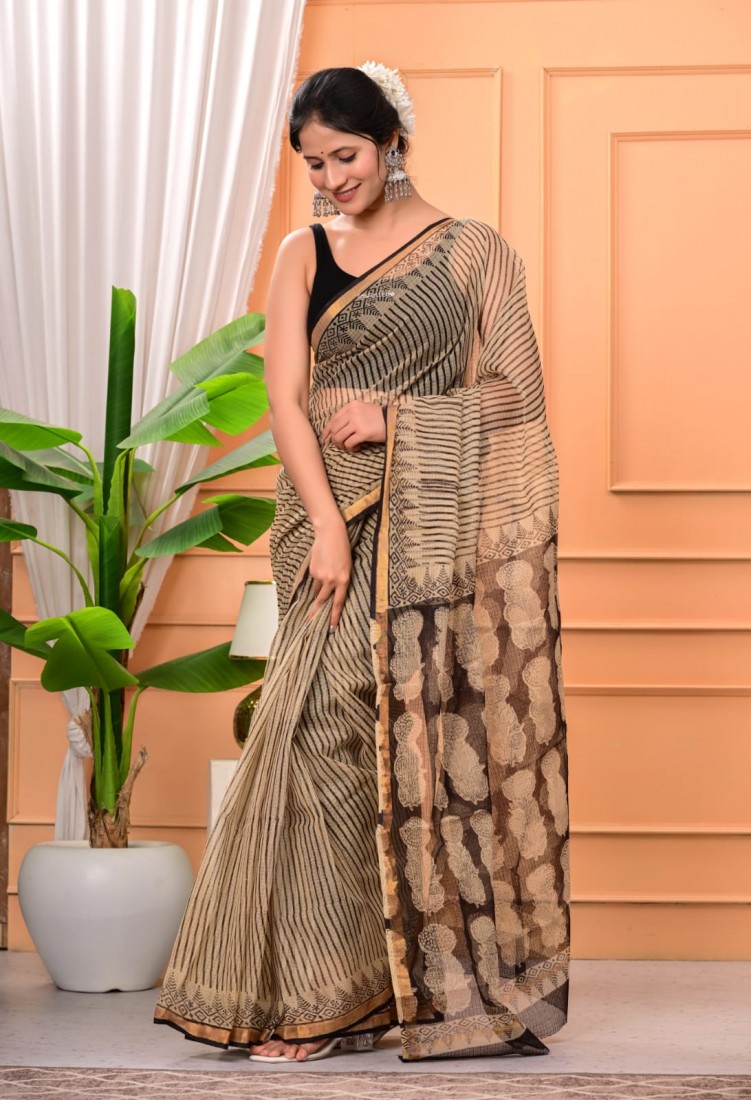 Hand block prints natural colors in kota doriya saree with blouse