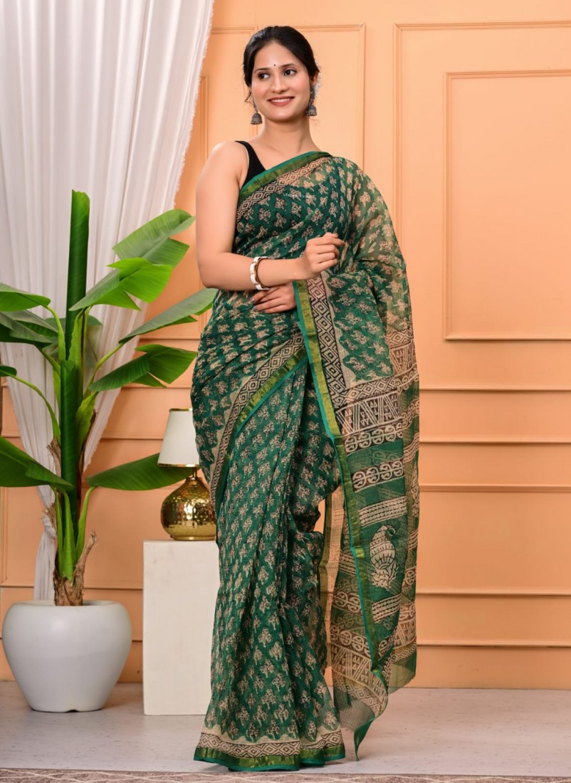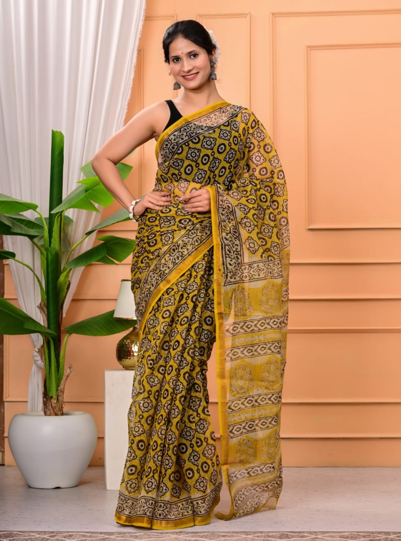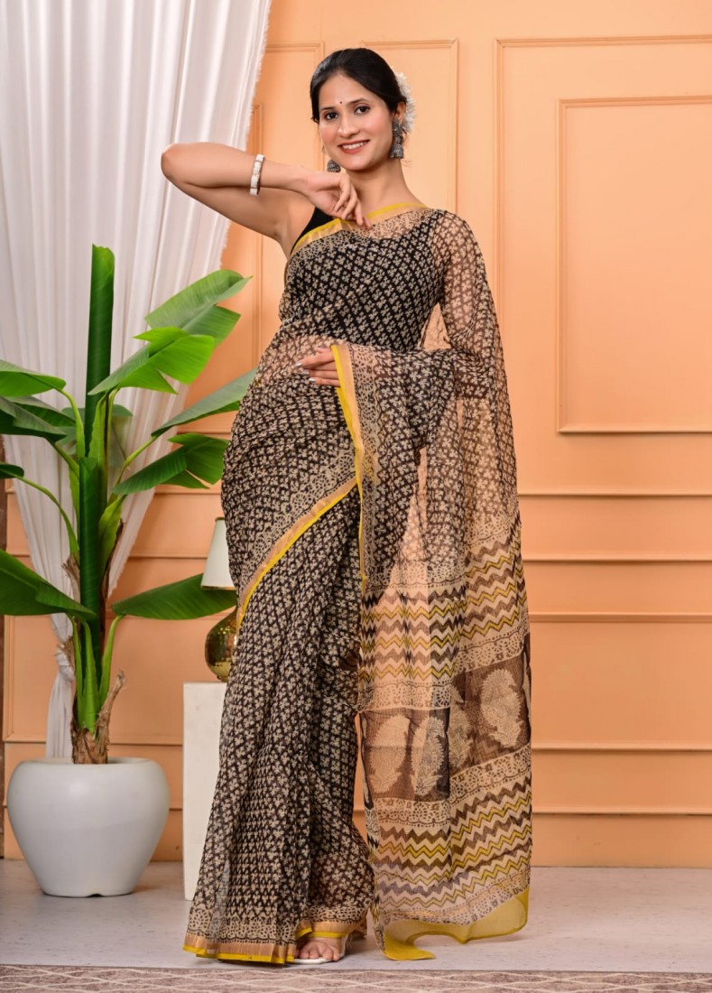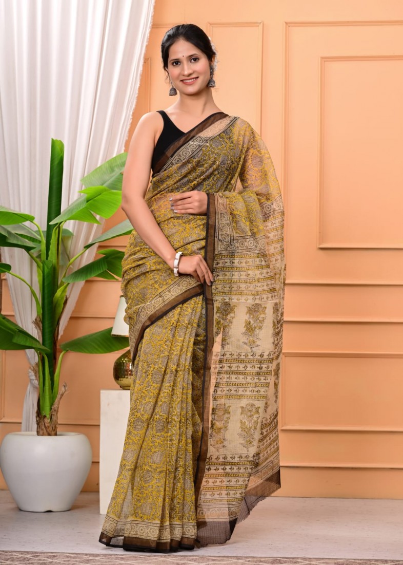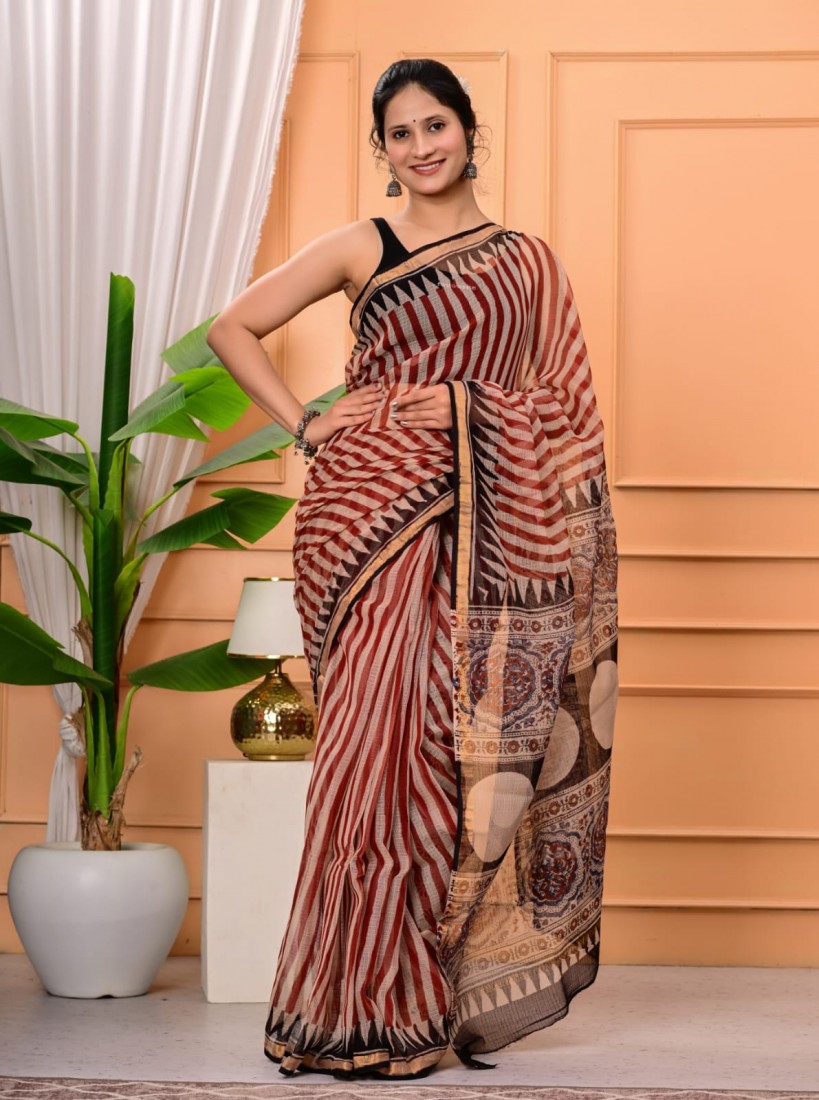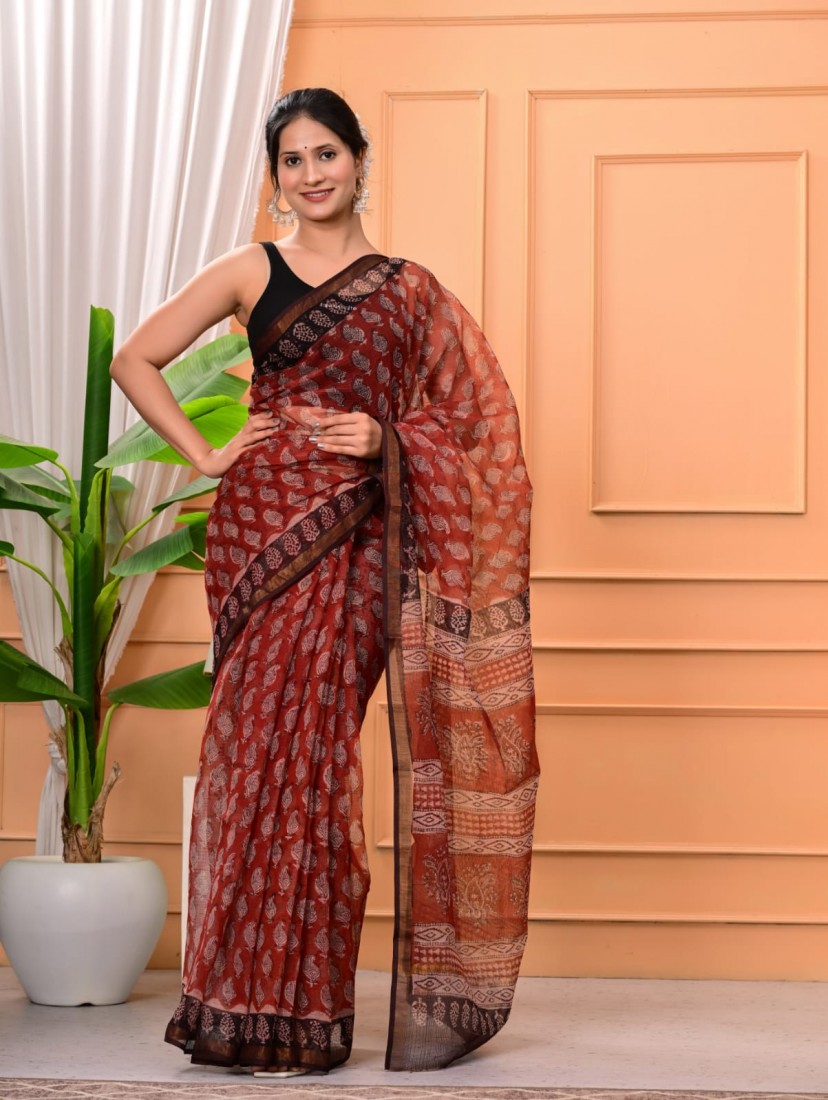 Hand block prints natural colors in kota doriya saree with blouse