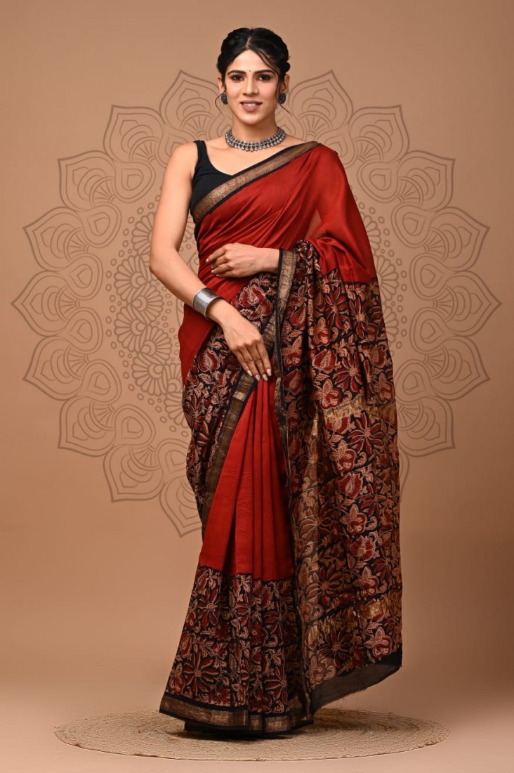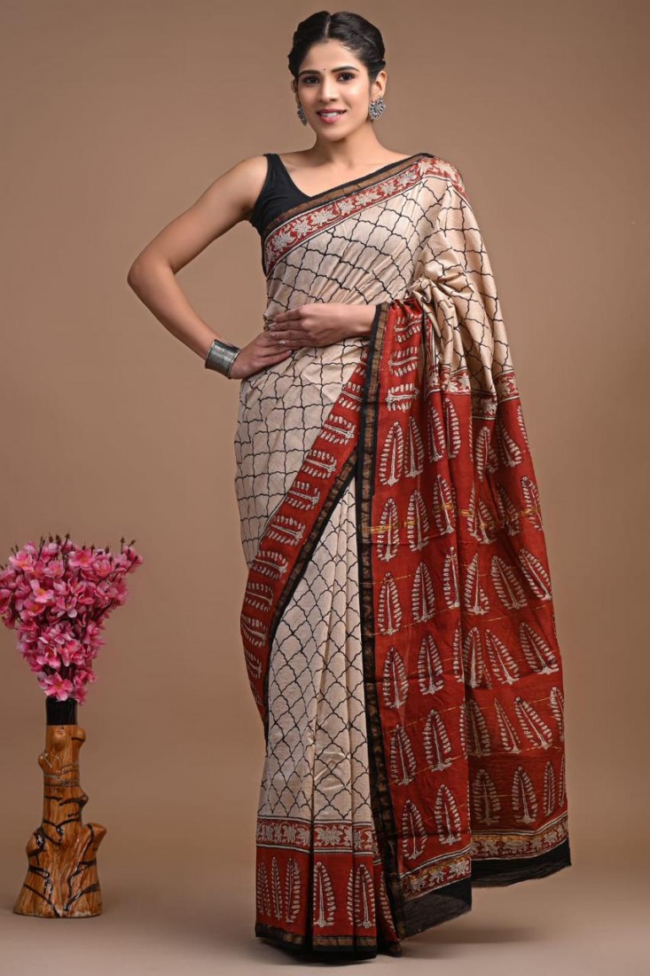 hand block prints natural colors in Maheshwari Silk saree With blouse
