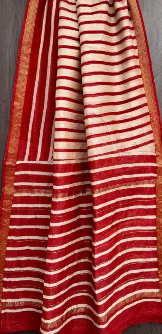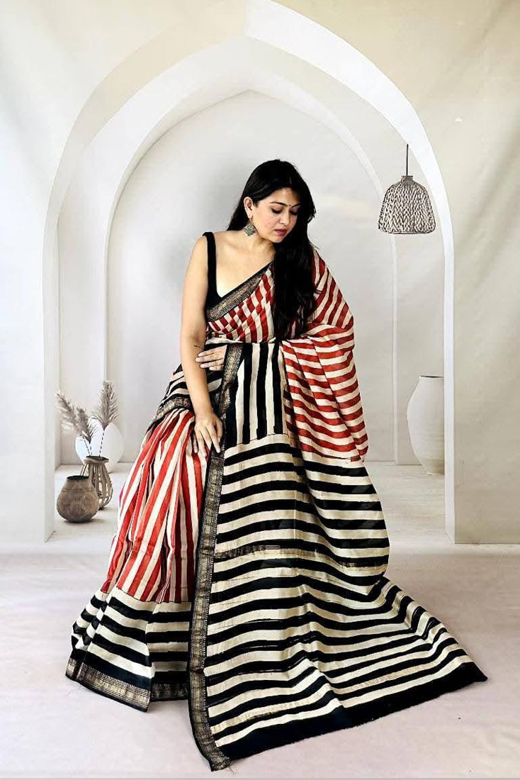 Elegant Red & Black Striped Silk Saree with Golden Border